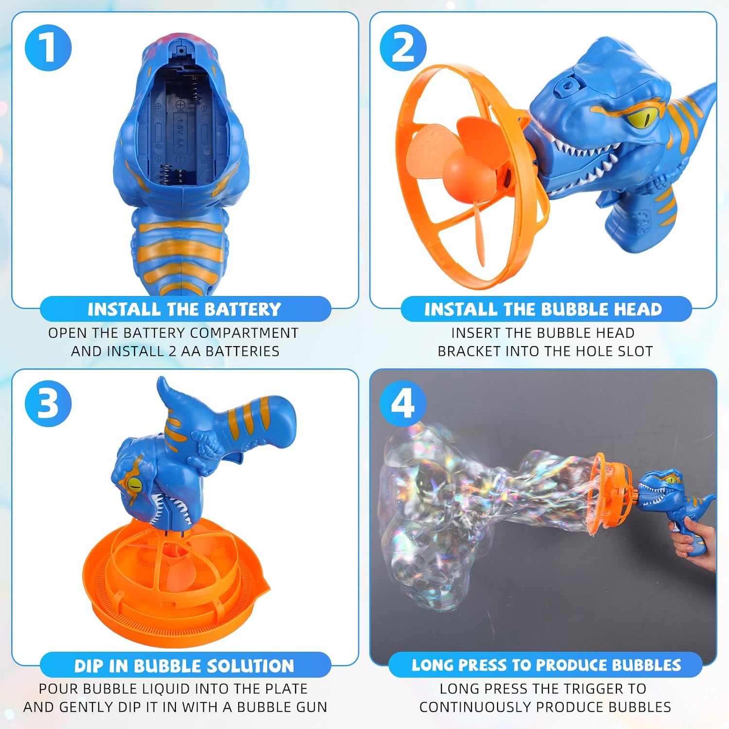 - Contains: (1) Dino Bubble Guns set, batteries (not included)